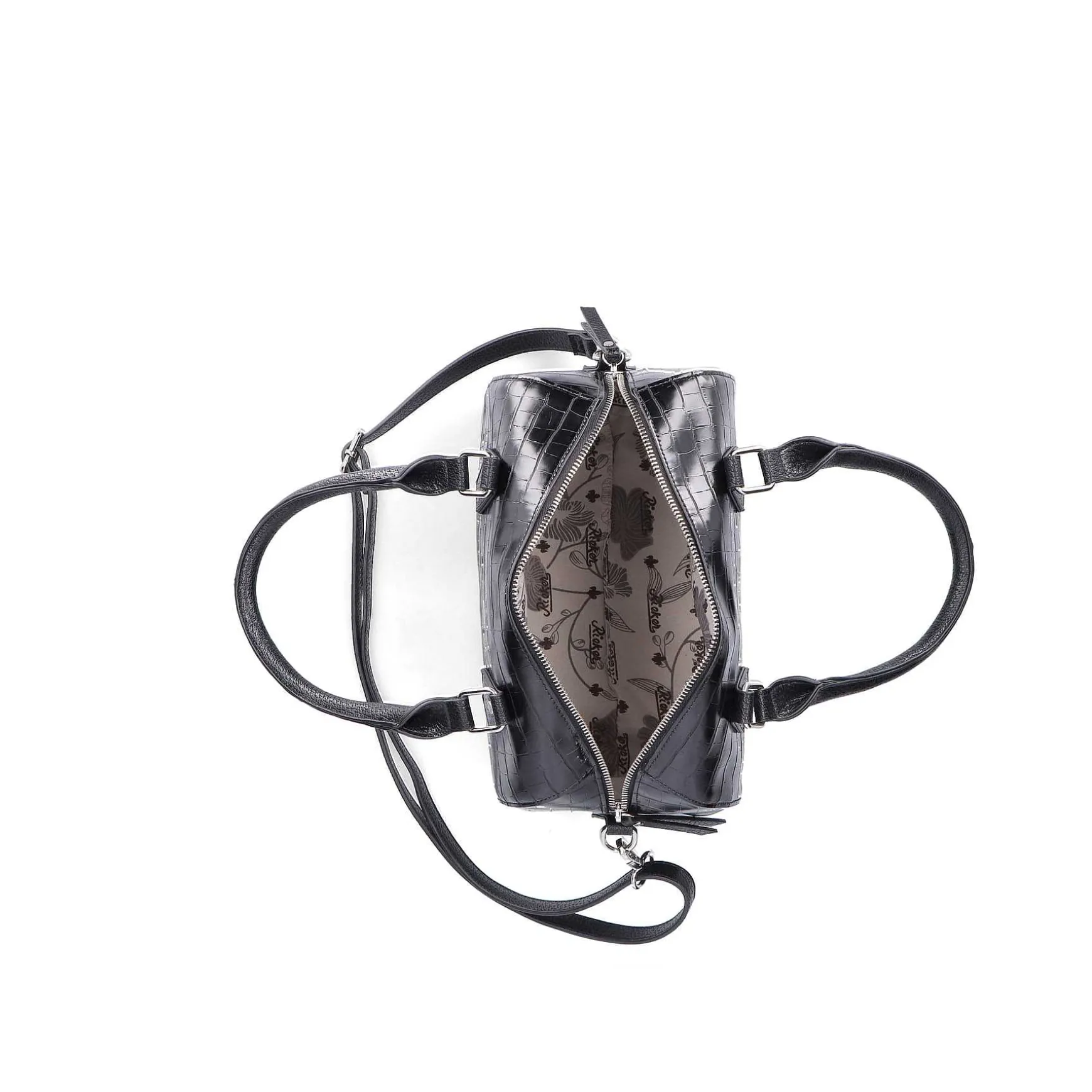 Denne Elegante Håndtaske Fra Rieker Imponerer Med Sin Enkelhed. Den Dybsorte Blanke Overflade I Den Klassiske Krokodillestil Giver Ethvert Outfit En Smart Finish! Vedhænget Med Sølvbogstaver Tilføjer En Stilfuld Accent. Tasken Har En Aftagelig Skulderrem, Som Gør At Den Kan Omdannes Til En Skuldertaske.